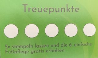 Sammeln Sie Treuepunkte. Bei jeder mobilen Fußpflegebehandlung erhalten Sie einen Treupunkt. Lassen Sie sich 5x abstempeln und erhalten die 6. Fußpflege gratis. Bei jeder Fußpflegebehandlung in der Praxis erhalten Sie auch Treuepunkte, 10x abstempeln und die 11. Fußpflege gratis erhalten.